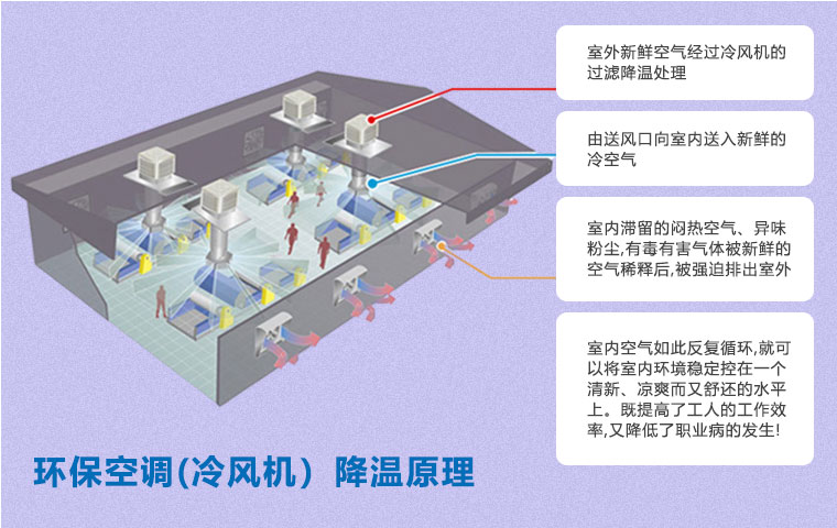 在空氣不流通的環(huán)境中,尤其是化工車(chē)間,容易產(chǎn)生建筑綜合癥,如悶熱、頭疼、眩暈、過(guò)敏、咳嗽等不適癥狀。使用環(huán)保空調(diào)(冷風(fēng)機(jī))通風(fēng)降溫方案即可以有效降溫,又能保證空氣流通